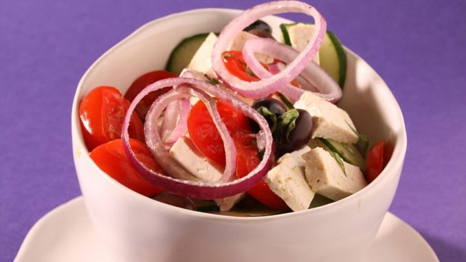 1) Distribuite in 4 ciotole i pomodorini tagliati in due, i cetrioli lavati e affettati, il tofu a cubetti, la cipolla a rondelle e le foglie di basilico spezzettate.